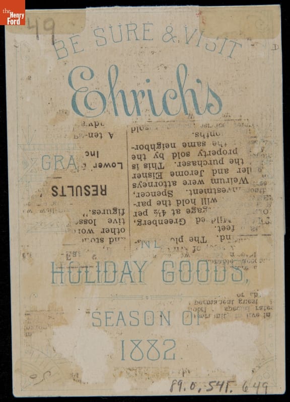 Advertised Ehrich's Department Store in New York. Card lithographed by Burrow-Giles Lithograph Co. in New York