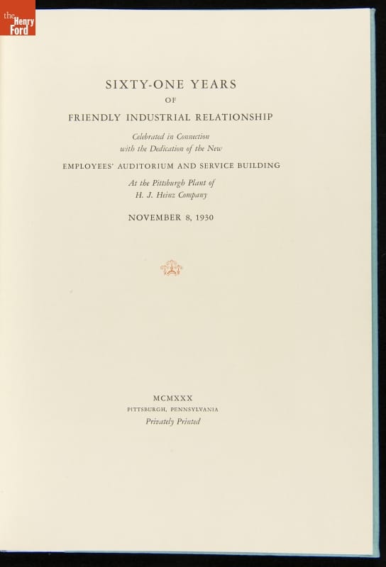 Book for the Dedication of Heinz Company Auditorium, "Sixty-One Years of Friendly Industrial Relationship," 1931