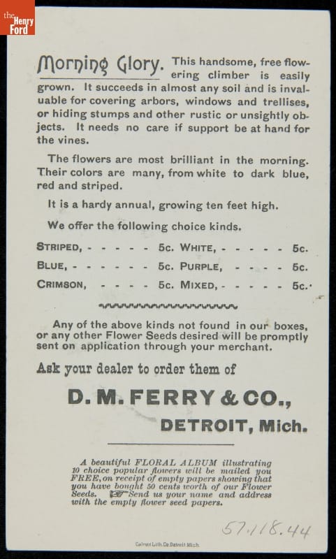 Advertisers used trade cards to sell goods and services and new color printing techniques increased their appeal during the late 19th century. Americans enjoyed and often saved the vibrant little advertisements added to product packages or distributed by local merchants. This trade card from D.M. Ferry & Co. features a colorful image of Morning Glory flowers with additional educational information on the back.