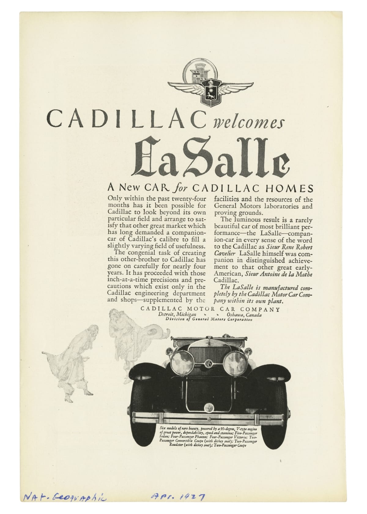 This 1927 LaSalle ad highlighted its relationship with the established Cadillac brand. The automobile's success led General Motors to create its first Art and Colour Section (later called Styling), appointing LaSalle stylist Harley Earl as director.