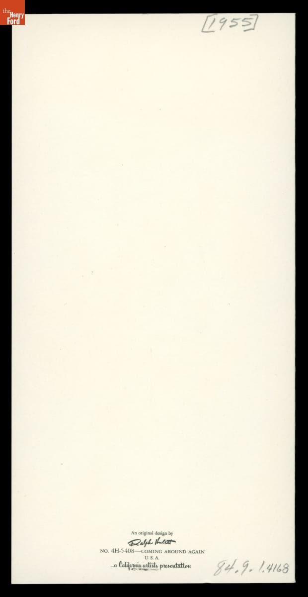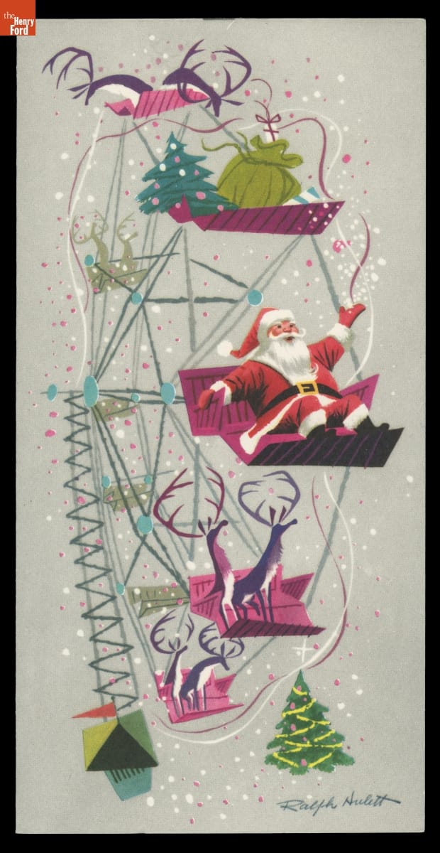 Artist Ralph Hulett (1915-1974) attended Chouinard Art Institute in Los Angeles. In 1937, while still in school, the young artist was hired by Walt Disney. Hulett would work for Disney for the rest of his career while continuing to exhibit his artwork in museums and galleries. Hulett also created commercial illustrations for various publications, including Ford Times, and in 1949 he began designing Christmas cards.