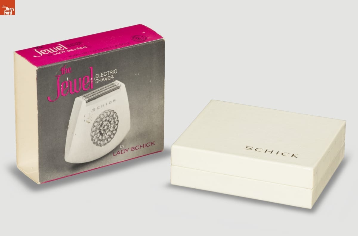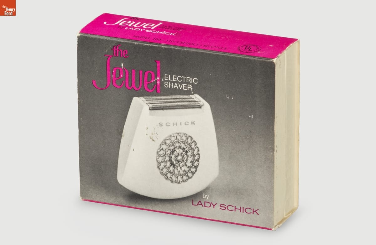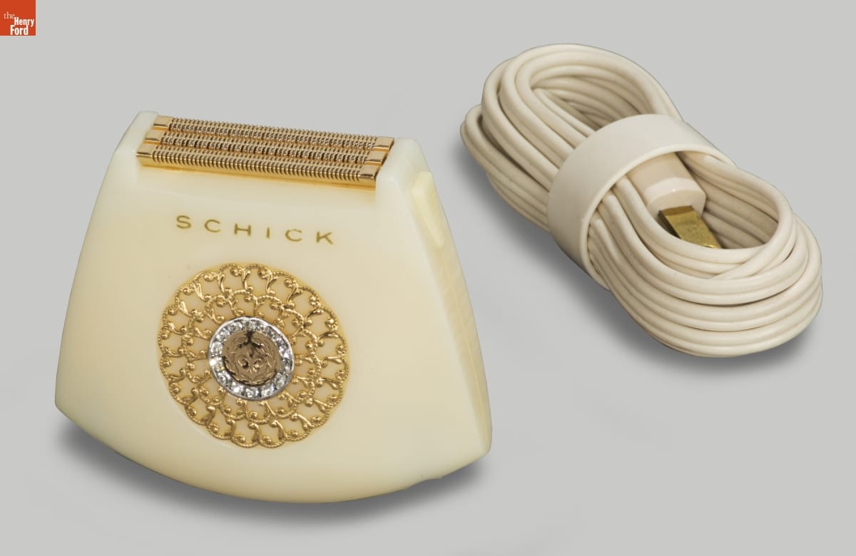 Starting in the 1940s, electric shavers were marketed and sold to women as an alternative to disposable razors. Advertisers claimed the shavers were gentler on skin than the ones for men. Women's shavers were made distinct from men's shavers by the softer design, wide range of colors, and decorative flourishes. Noted industrial designer Mel Boldt and Associates designed this product.