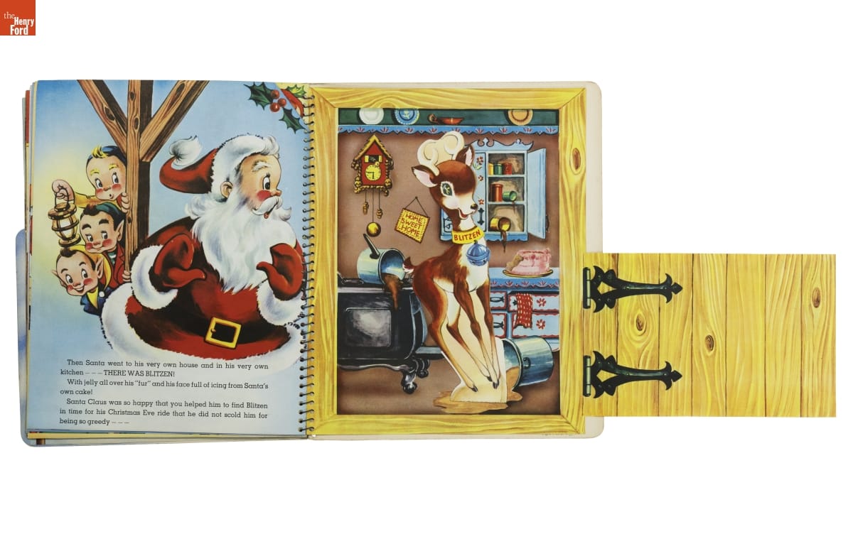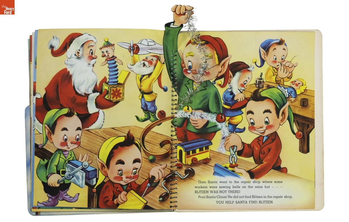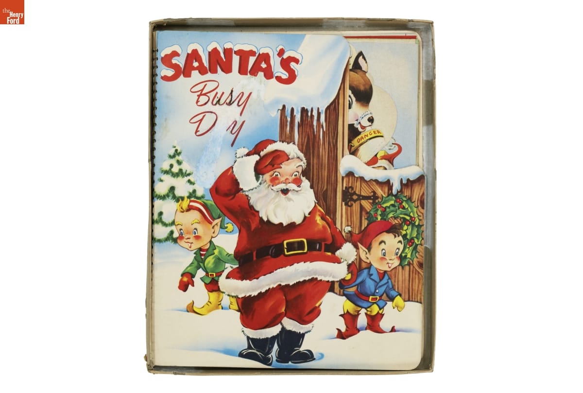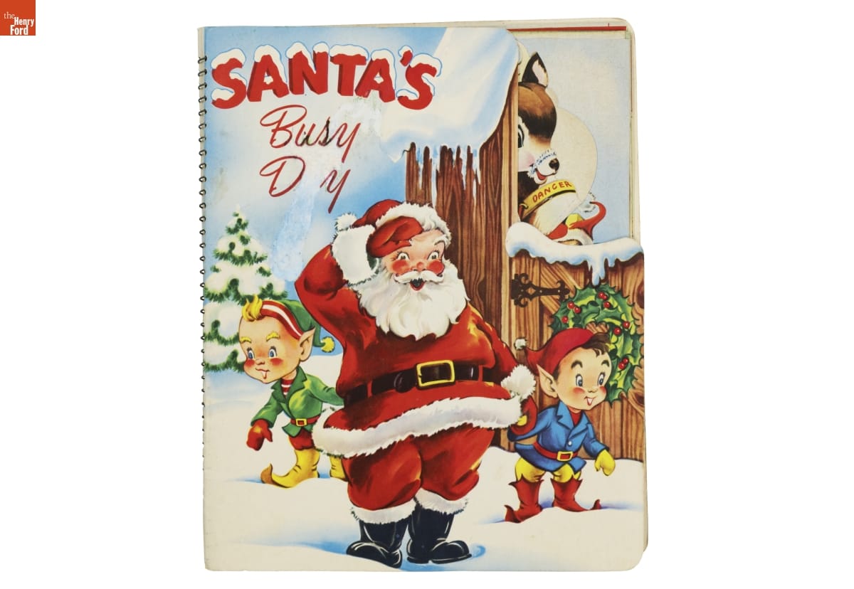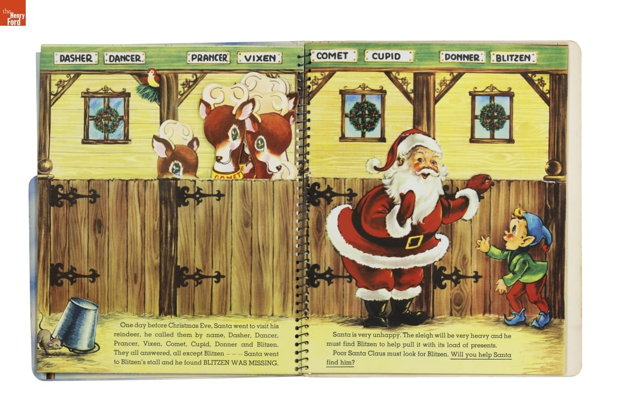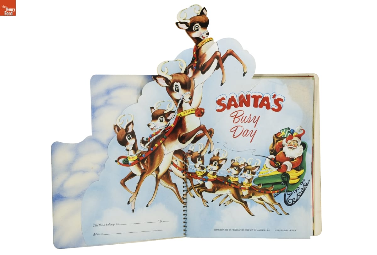 Santa's Busy Day follows jolly St. Nick as he looks for Blitzen, a lost reindeer. The book asks children to help Santa with his search. Readers turn pages to discover images that move and pop up; or find things to do--move cutouts of Santa's reindeer or color a picture of Blitzen. Books like this entertained young kids and encouraged them to enjoy reading.