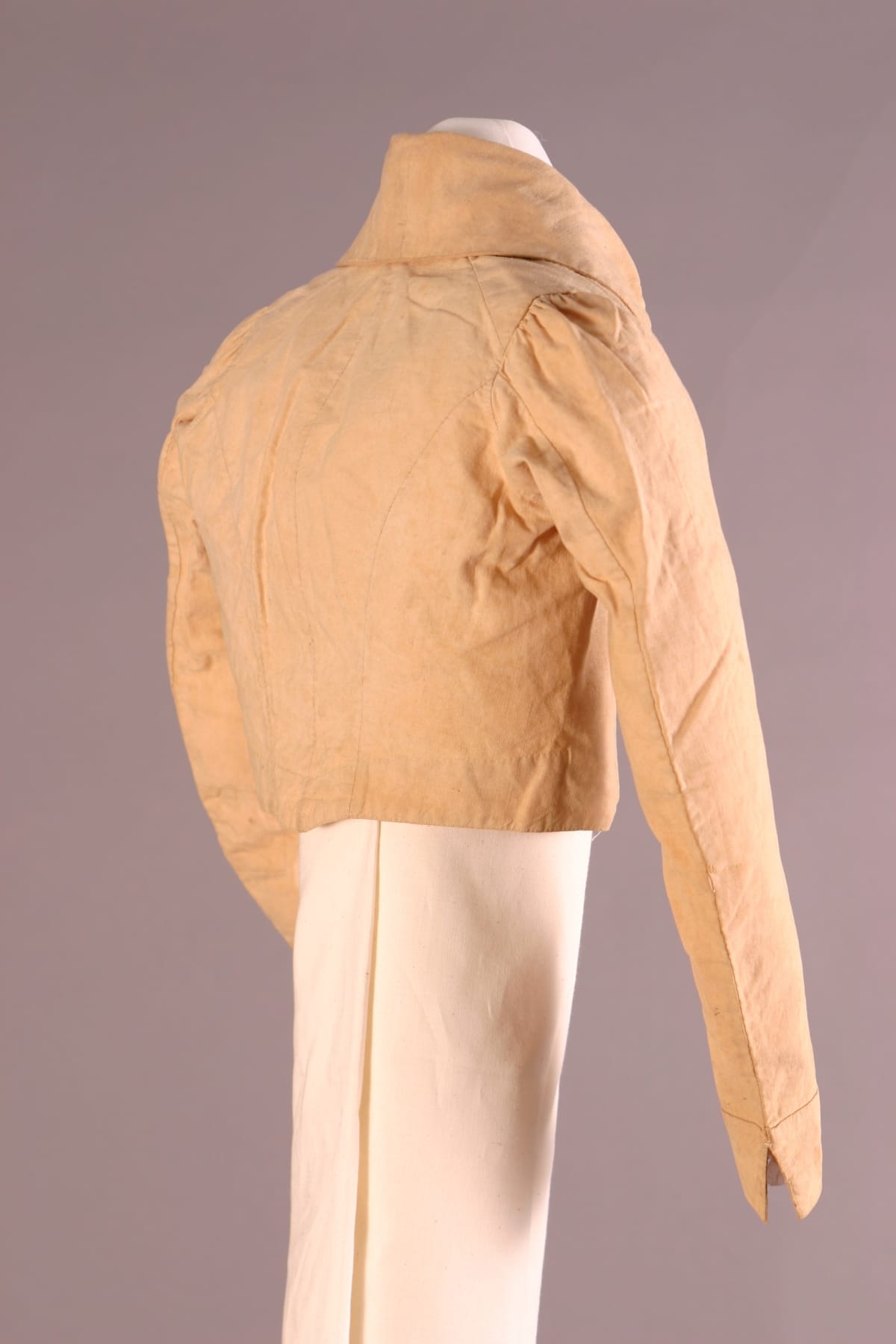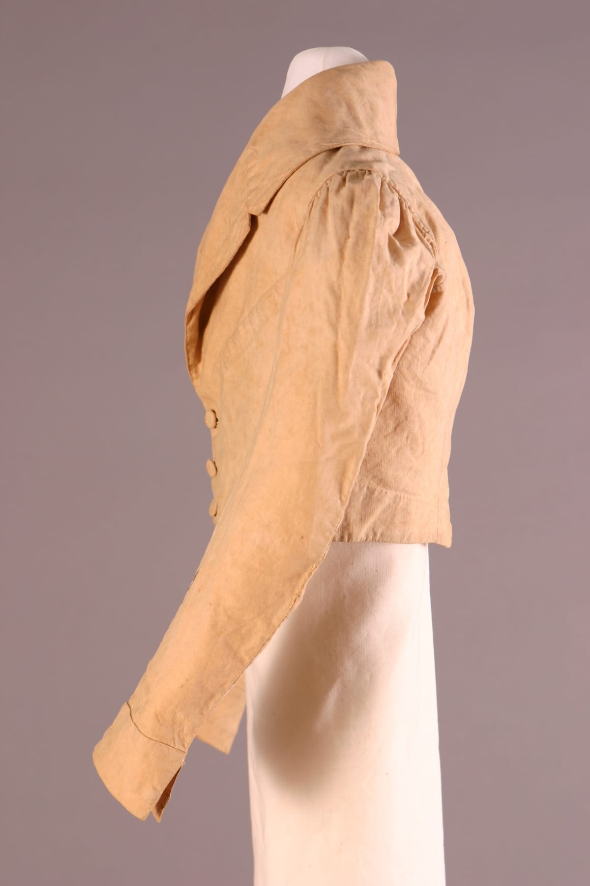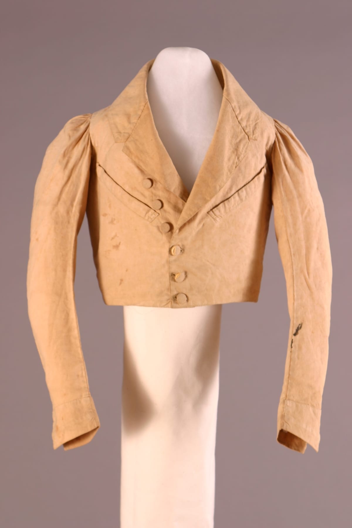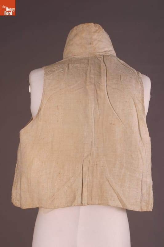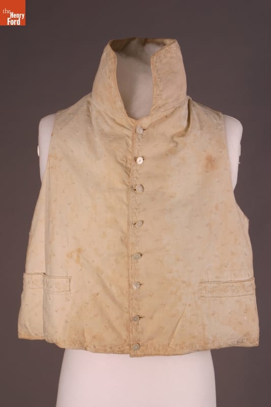 Inspired by French fashion, men of early nineteenth-century America padded their chests with layers of clothing. To achieve the stylish large-chested look, they often donned frilled shirts, puffy neckbands called cravats, at least one waistcoat - or vest - like this, and an overcoat with a very high, stiff collar.