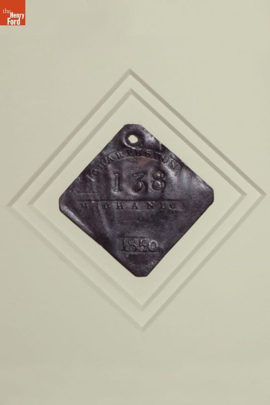 Slave hire badges were worn by enslaved African Americans whose owners hired them out to work for other people. Their wages went back to the owner. Badges were used to identify individuals in Savannah, Georgia; Charleston, South Carolina; Mobile, Alabama; and New Orleans, Louisiana. This badge for a mechanic was issued in Charleston.