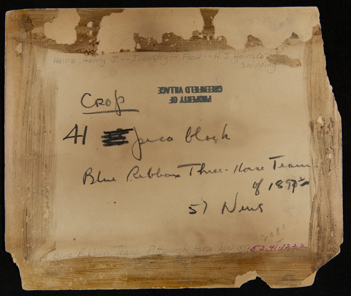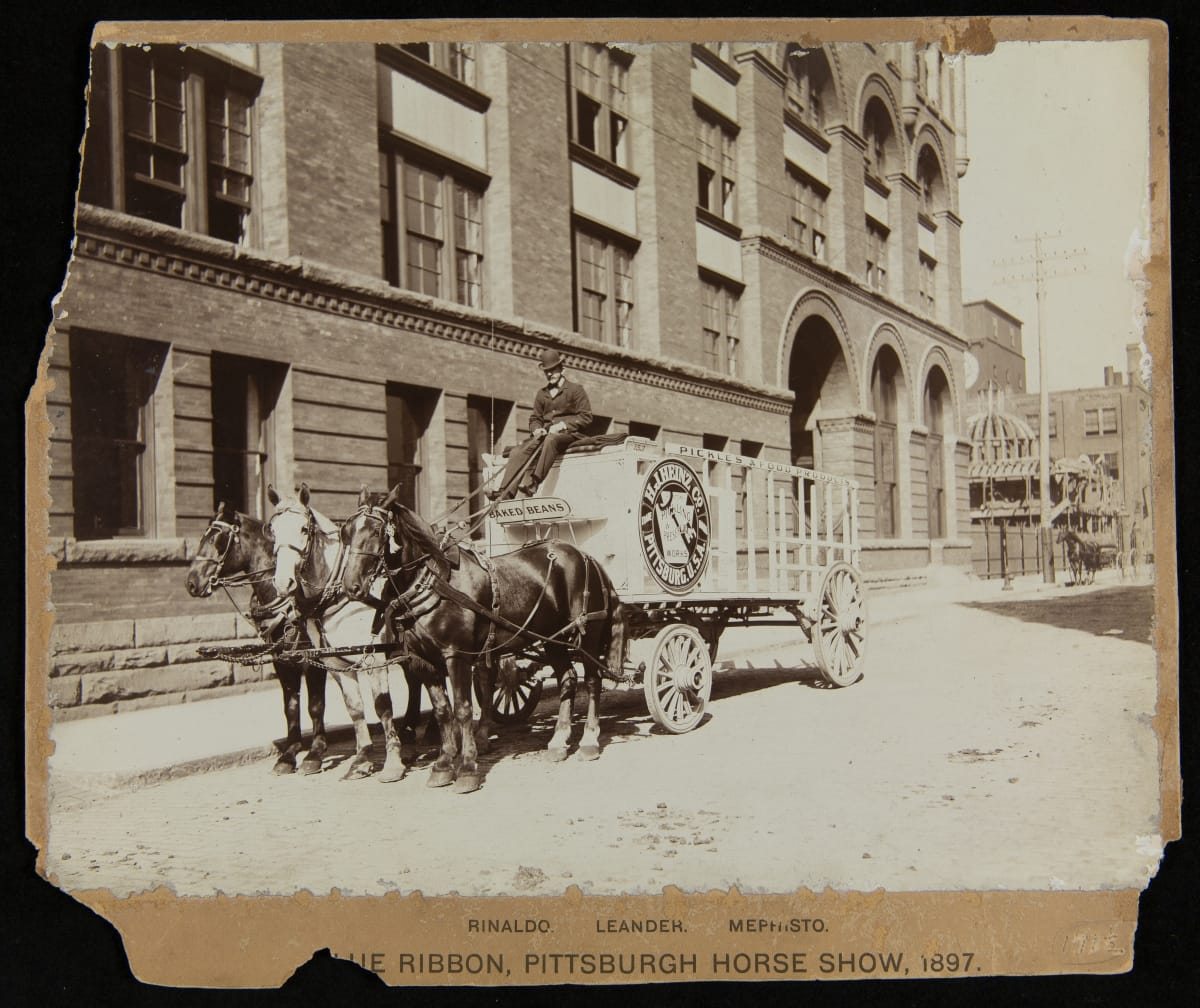 Before the 1920s, the H.J. Heinz Company transported their goods by rail and by horse-drawn wagons. Heinz's horse teams consisted of all-black horses with the exception of the "Blue Ribbon Team" -- a three-teamed wagon drawn by two black horses with a gray horse in the middle. This photograph from 1897 shows the Blue Ribbon Team at a horse show.