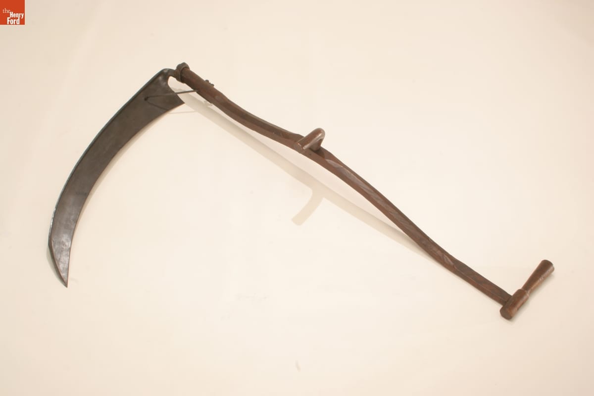 Scythes helped farmers harvest hay and other grasses quickly. The long sharp blade cut large swaths through the crops. The long handle allowed harvesters to work upright, which removed the bending and stooping required when using a sickle. Swinging a scythe was still hard work. In the 19th century, innovative farmers created mowing machines that made harvesting hay even easier.