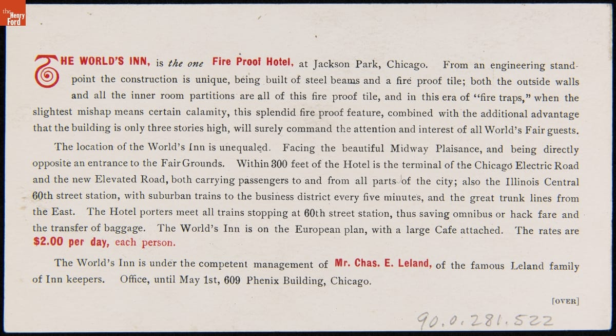 The World's Columbian Exposition in Chicago attracted more than 25 million visitors in 1893. It was a prime business opportunity for hotels like the World's Inn, located just steps away from one of the fair's entrances. The hotel's fireproof steel-beam construction was another important selling point -- particularly when memories of the 1871 Great Chicago Fire remained prevalent.
