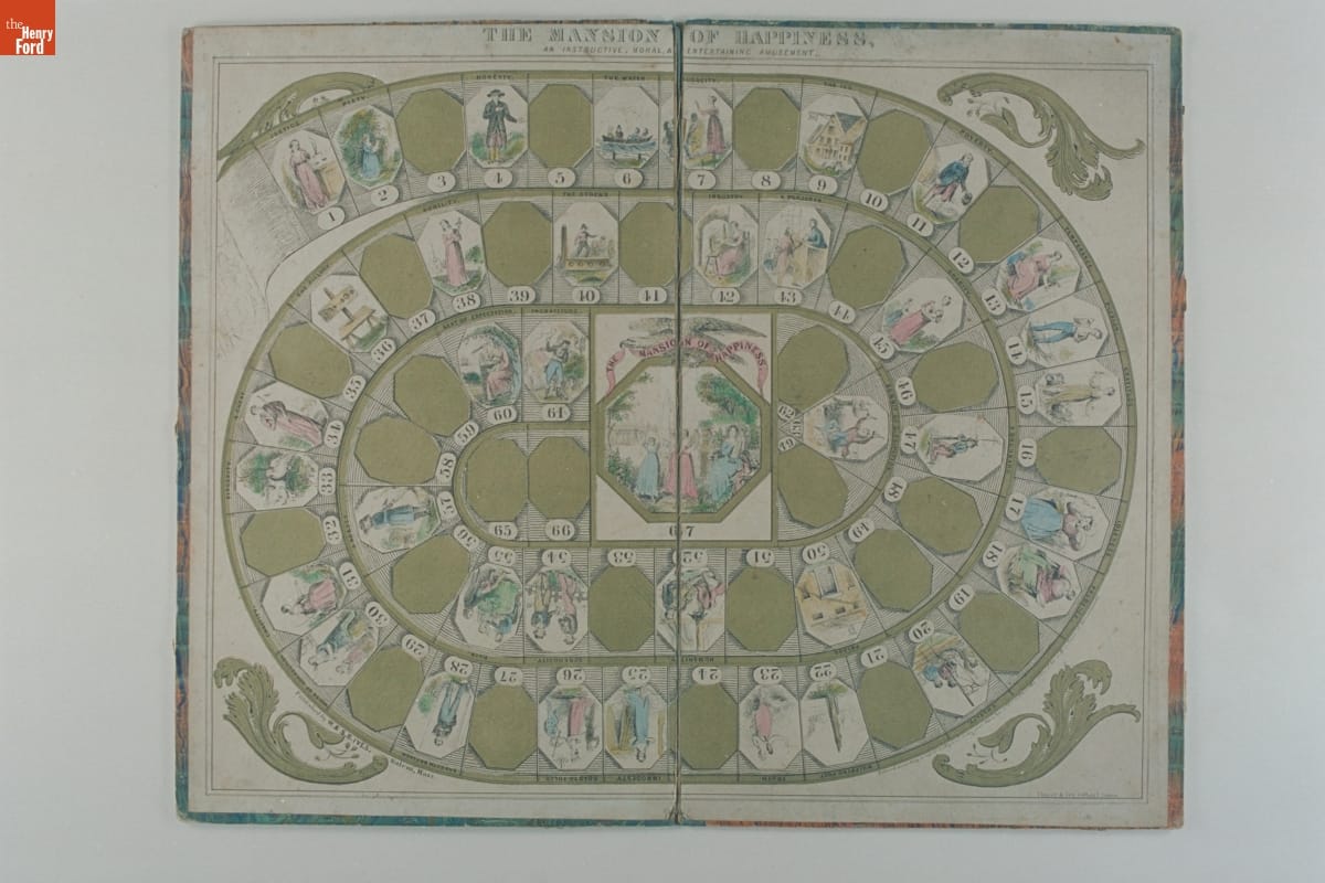 The 19th-century game "The Mansion of Happiness" taught children moral lessons and instilled values of thrift, honesty and industry as they journeyed around the board. Developed in the 1840s by Anne W. Abbott, a daughter of a New England clergyman, the game remained popular throughout the 1800s. Versions and copies of this moral-lessons game were made well into the 1900s.