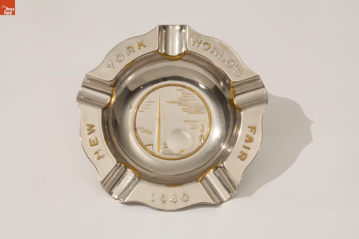 The 1939-40 New York World's Fair encouraged a depression-weary public that the future would be rosy. Souvenirs often reflected the exposition's utopian "Building the World of Tomorrow" theme. This ashtray depicts the fair's futuristic architectural icons, the Trylon and Perisphere.