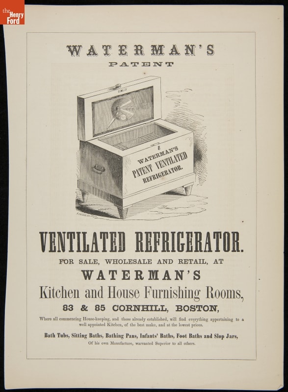 Advertisement for Waterman's Patent Ventilated Refrigerator, 1857