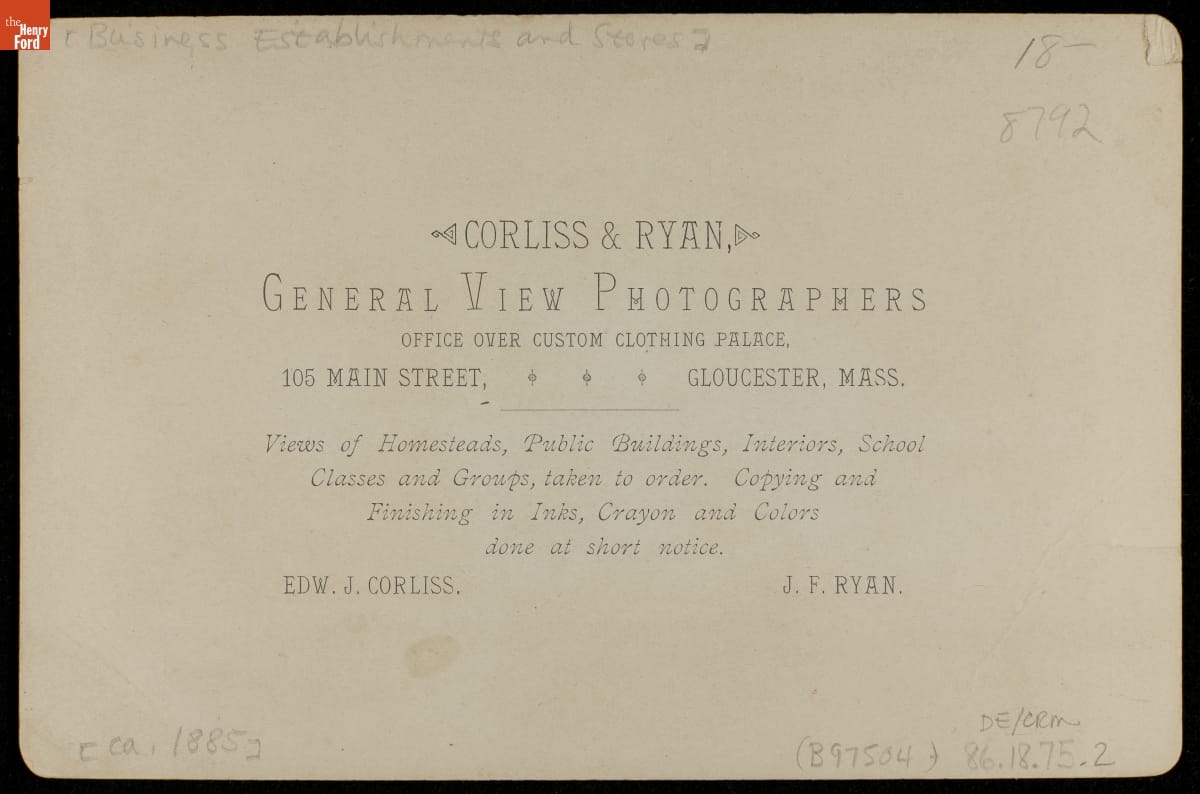 obverse, handwritten, lower edge: Store of A. Lee, Gloucester. verso: Corliss & Ryan, General View Photographers . . .
