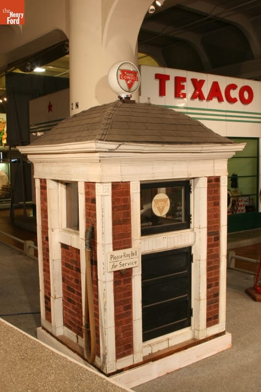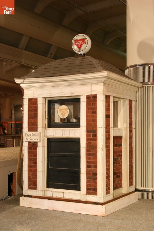 Samuel W. Raymond built this filling station in 1915. It serviced automobiles in Adrian, Michigan, providing gas, oil, and water. Raymond used a glass tank to show drivers the amount of gasoline they purchased and claimed to be the first visible-delivery gasoline station. Cars lined the street for service. In 1930, when the street was widened, the station was donated to The Henry Ford.