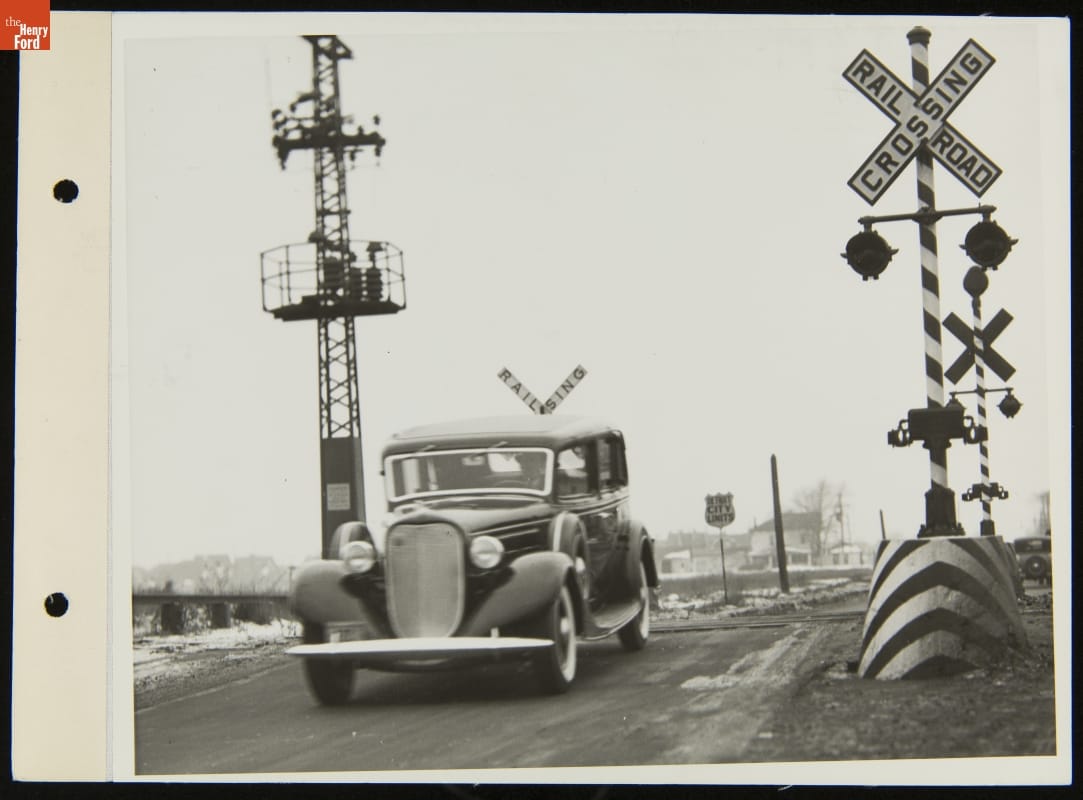 Lincoln Automobile Driving Over Railroad Crossing, December 1934