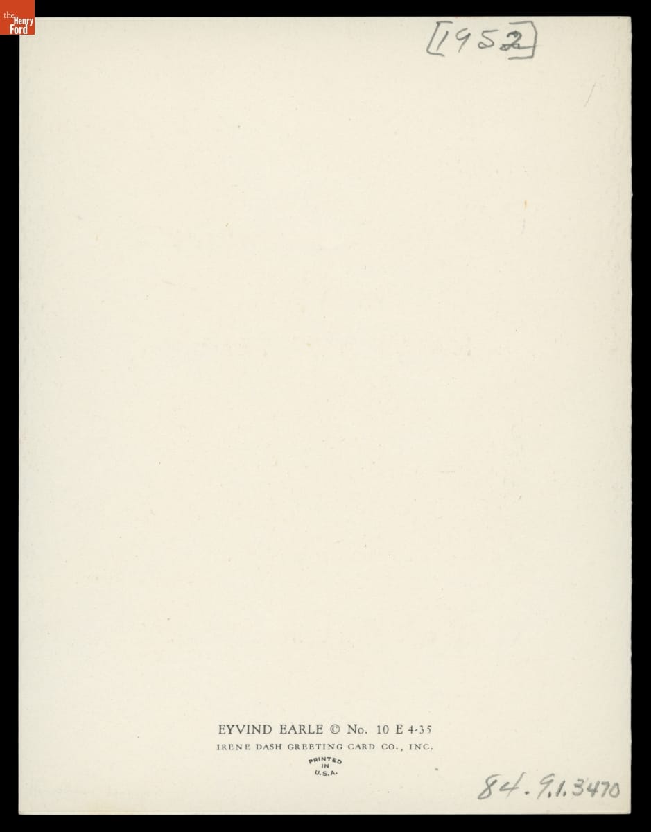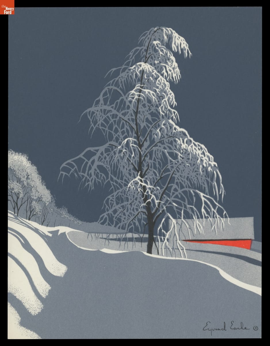The artist Eyvind Earle (1916-2000) is best known for his work on the 1959 Walt Disney Studios animated film Sleeping Beauty, but he also designed Christmas cards. Earle began producing cards in his early twenties, selling them through his own company. Later, Earle joined the American Artists Group and continued designing Christmas cards. He would produce more than 800 designs throughout his career.