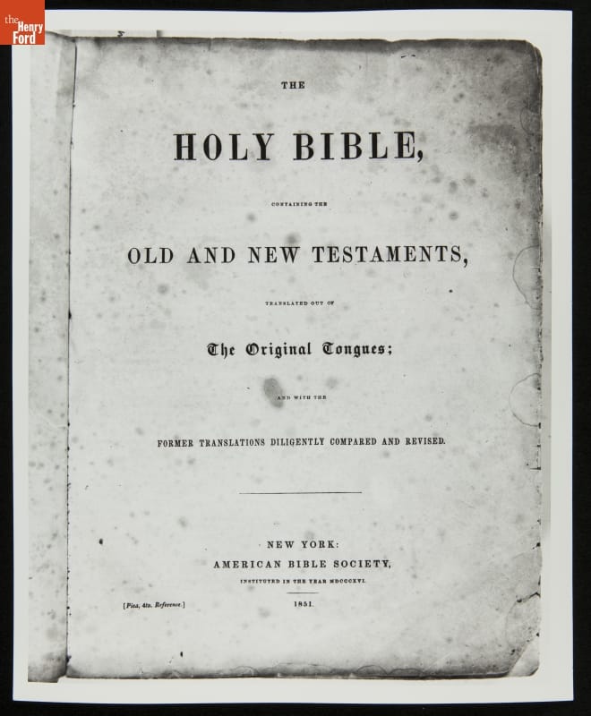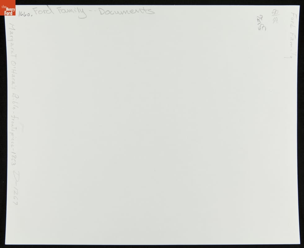 Margaret Ahern (or O'hern), Henry Ford's foster grandmother, received this bible as a Christmas gift from her friend Mrs. Thomas W. Palmer. Margaret Ford, Henry's sister, inherited the bible, and years later, she gave it to Henry when he was restoring the Ford home. The bible contains pages for recording significant family events. Ford family births, marriage and deaths were documented.