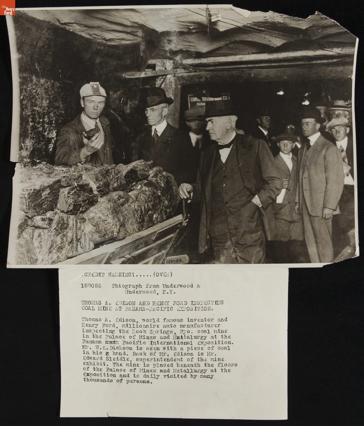 CREDIT WARNING!....(OVER) 188052 Photograph from Underwood & Underwood, N.Y. THOMAS A. EDISON AND HENRY FORD INSPECTING COAL MINE AT PANAMA-PACIFIC EXPOSITION. Thomas A. Edison, world famous inventor and Henry Ford, millionaire auto manufacturer inspecting the Rock Springs, Wyo. coal mine in the Palace of Mines and Metallurgy at the Panama Pacific International Exposition. Mr. W.E. Dickson is seen with a piece of coal in his hand. Back of Mr. Edison is Mr. Edward Sleidle, superintendant of the mine exhibit. The mine is placed beneath the floors of the Palace of Mines and Metallurgy at the Exposition and is daily visited by many thousands of persons.