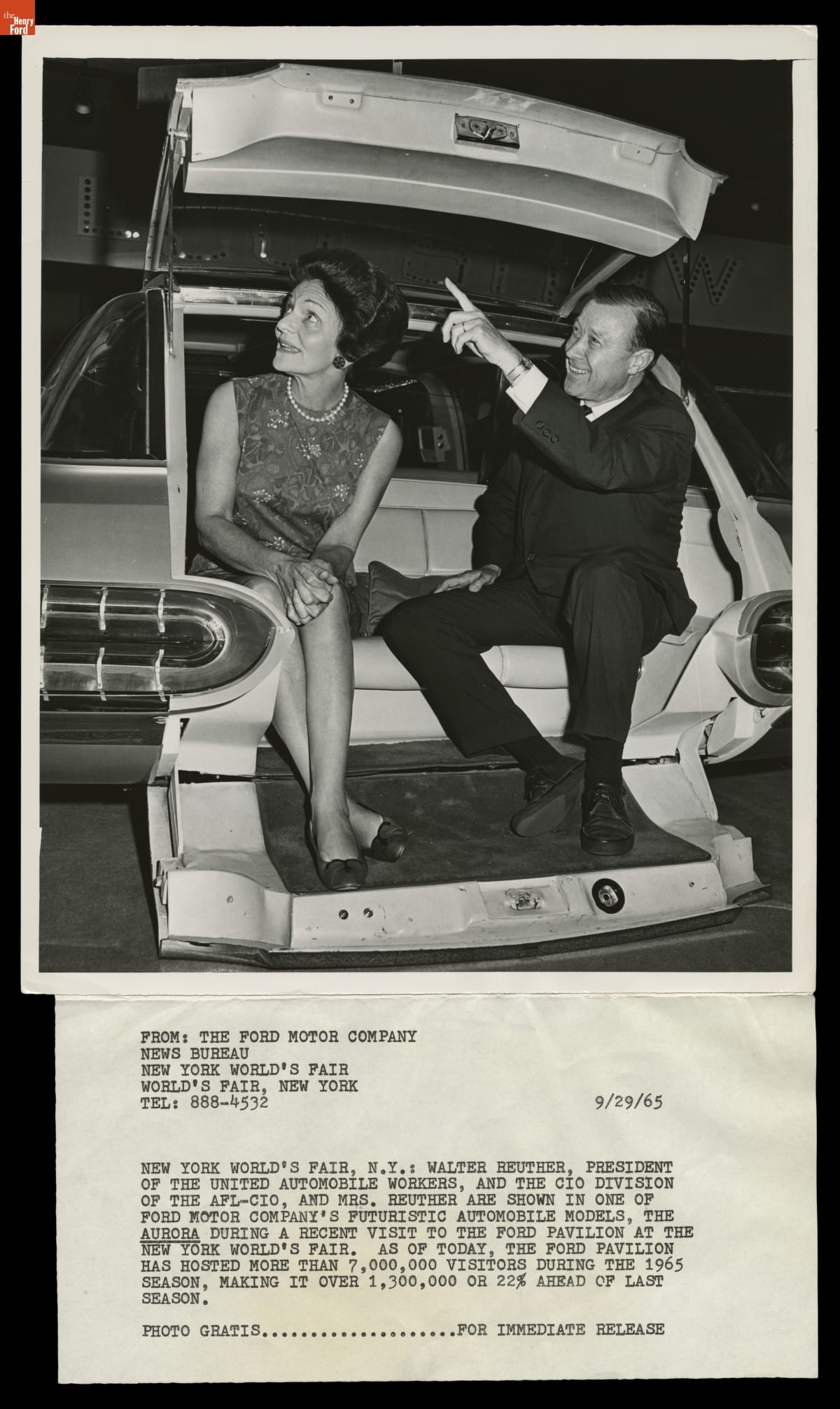 United Auto Workers president Walter Reuther and his wife May Reuther visited Ford Motor Company's pavilion at the 1964-65 New York World's Fair. Ford worked with Walt Disney to create its exhibits and experiences at the fair. The highlight was the Magic Skyway ride, in which guests sat in Ford convertibles through a Disney-designed show.
