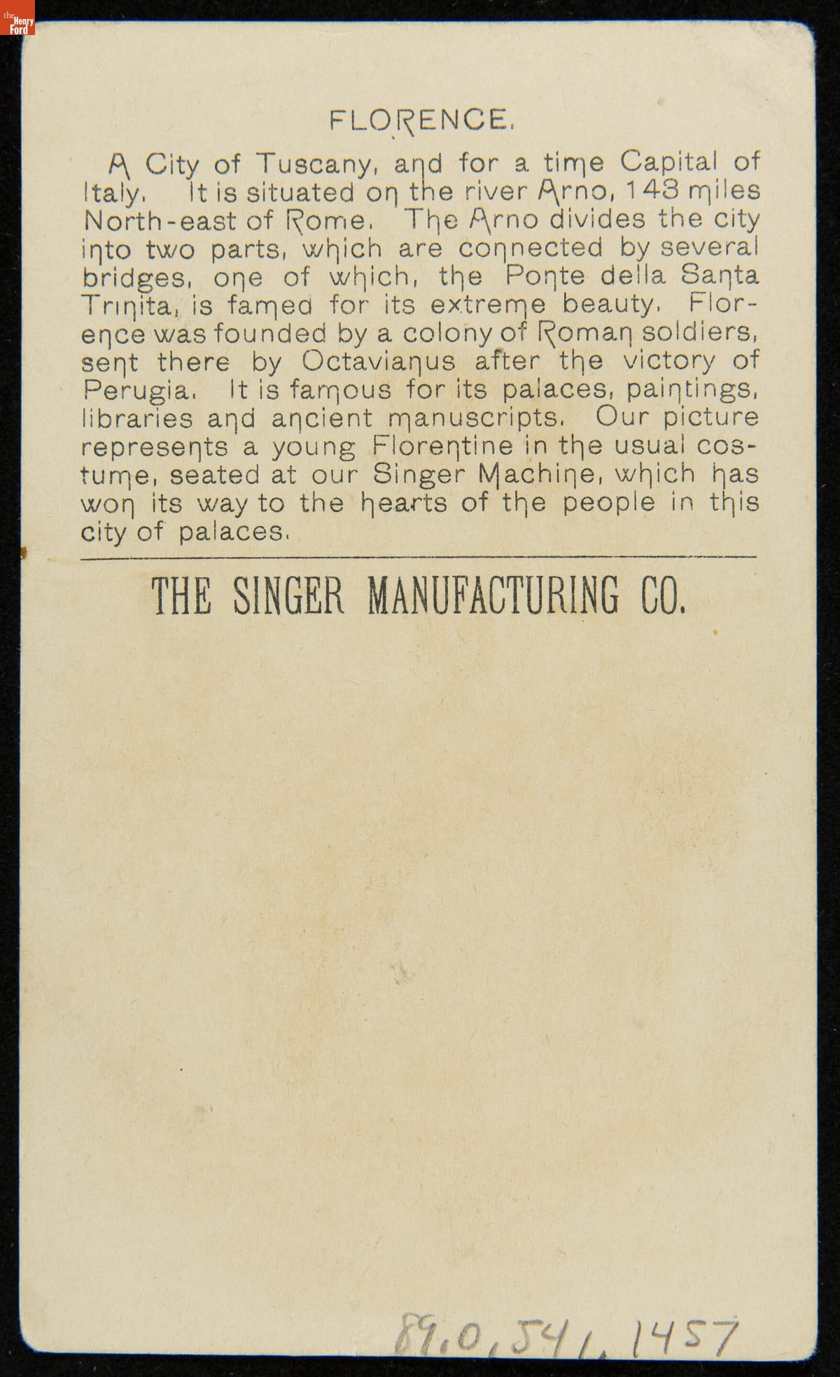 As color printing gained momentum in the late 19th century, trade cards became a major means of advertising goods and services. Americans enjoyed and often saved the vibrant little advertisements found in product packages or distributed by local merchants. The Singer Sewing Machine Company had a series of trade cards, like this one, offering images of Singer machine users from around the world in their national dress.