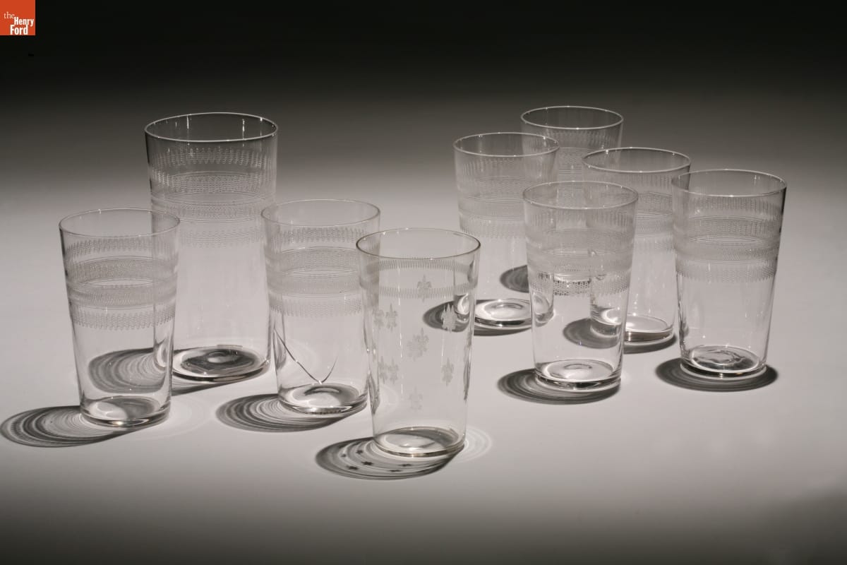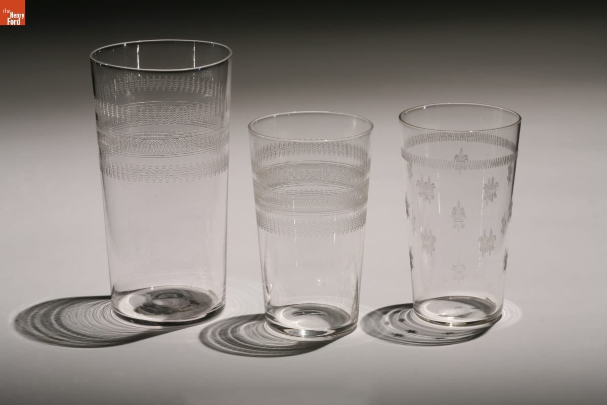 George Newhall of San Francisco, California, used these glass tumblers for picnics and outings. They were packed in his fancy "Park Drag" carriage. Well-to-do gentlemen like Newhall drove carriages like these to social events like horse races. There they could enjoy an excellent view from their high seat atop the vehicle while servants served them food and drinks from inside.