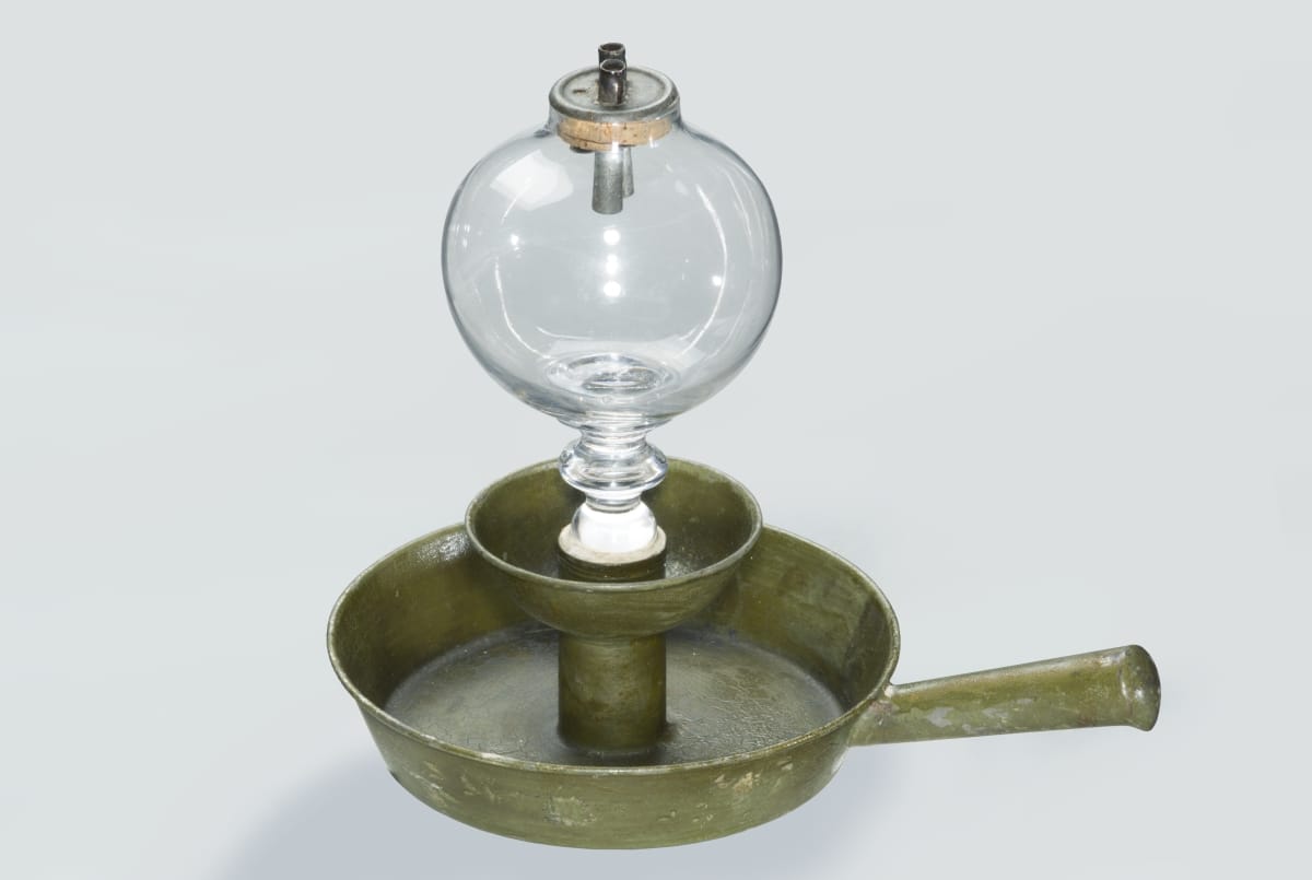 Traditional make-dos are useful and precious objects that broke during their working lives. Their owners felt compelled to restore or repurpose these objects in a variety of ways. The glass base of this lamp broke and it was given a new base made of tin.