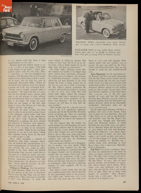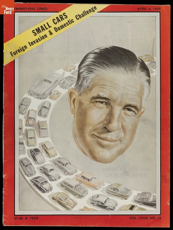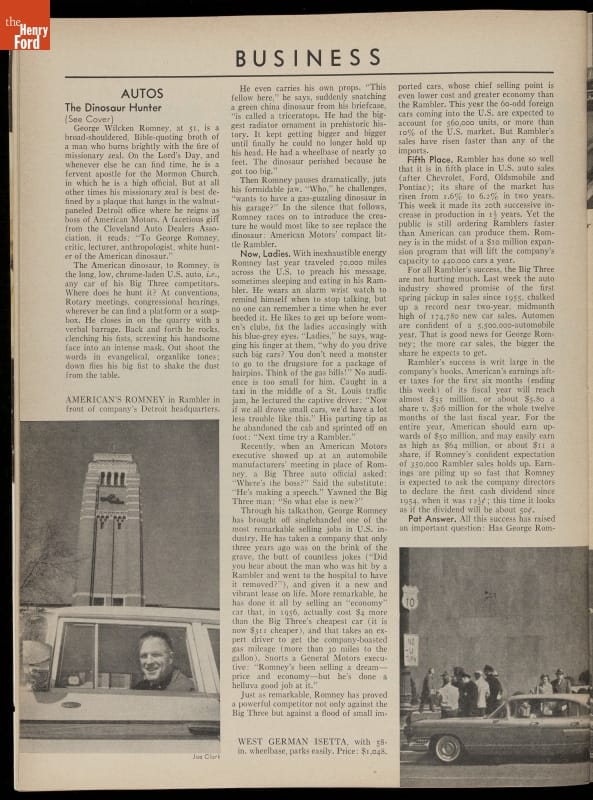 George Romney, chairman and president of American Motors Corporation, made waves in the auto industry with his vocal criticism of the large cars he dismissed as "gas-guzzling dinosaurs." He championed AMC's small Rambler American and coined the term "compact car" to describe it. Romney later went into politics and served as Michigan's governor from 1963 to 1969.