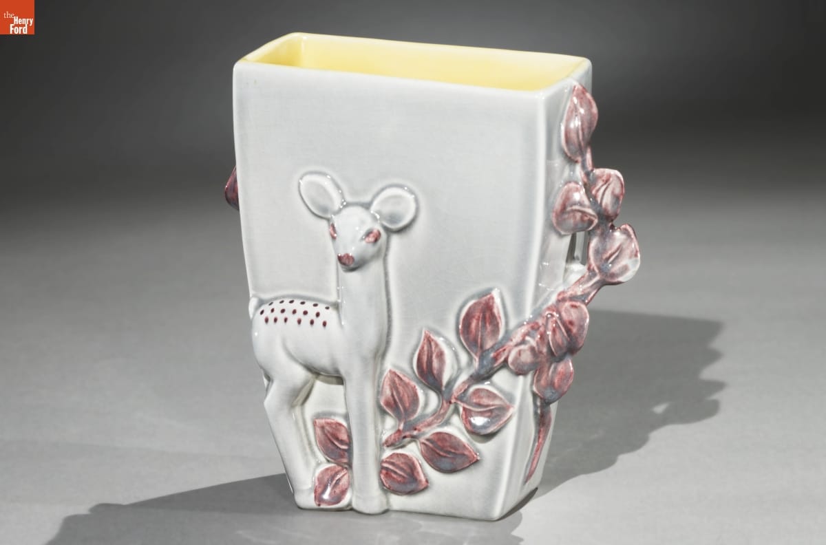 The Red Wing Company was famous for its stoneware crocks and jugs beginning in the 19th century and continuing throughout much of the 20th century. In 1938, they started a decorative art pottery line. This vase with a deer in relief was typical of the kinds of pieces made for middle class homes in the 1940s and 1950s.