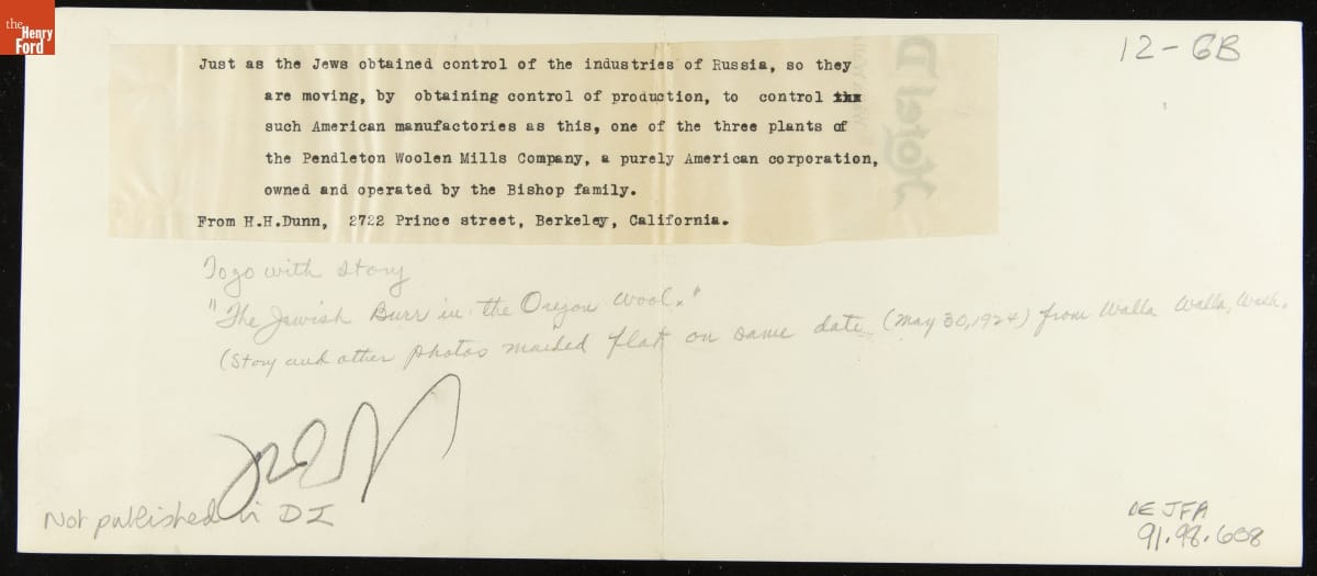 Beginning in 1920, the Henry Ford-owned weekly newspaper The Dearborn Independent ran a series of front-page articles that denounced all things Jewish. Though the series ended in 1922, the weekly continued anti-Jewish diatribes in other articles, most notably those attacking Aaron Sapiro, a farm cooperative organizer. This photograph, though it appears harmless, was part of that campaign. Typewritten comments on the back expose its true purpose.