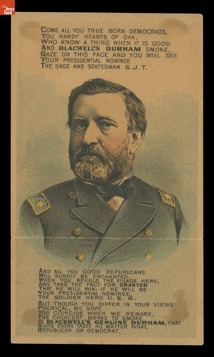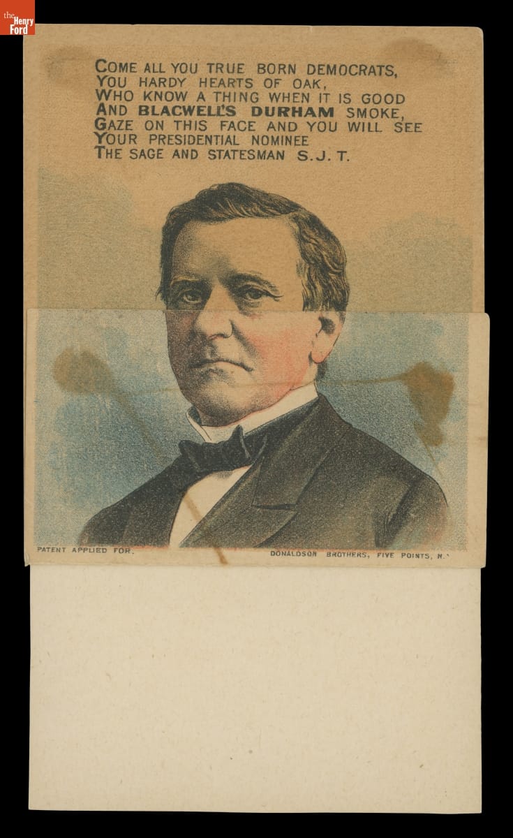This 1880 political advertisement catered to both Democratic and Republican voters. With the flap turned up, the front displays an image of Samuel J. Tilden, who failed to secure the Democratic Party's nomination for President. Turn the flap down, and the image of Ulysses Grant, the unsuccessful candidate for the Republican Party's nomination, appears. Either way, the Blackwell's Durham Tobacco Company wins.