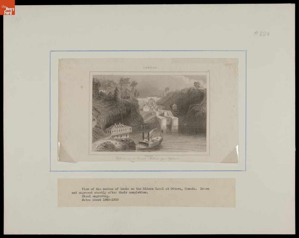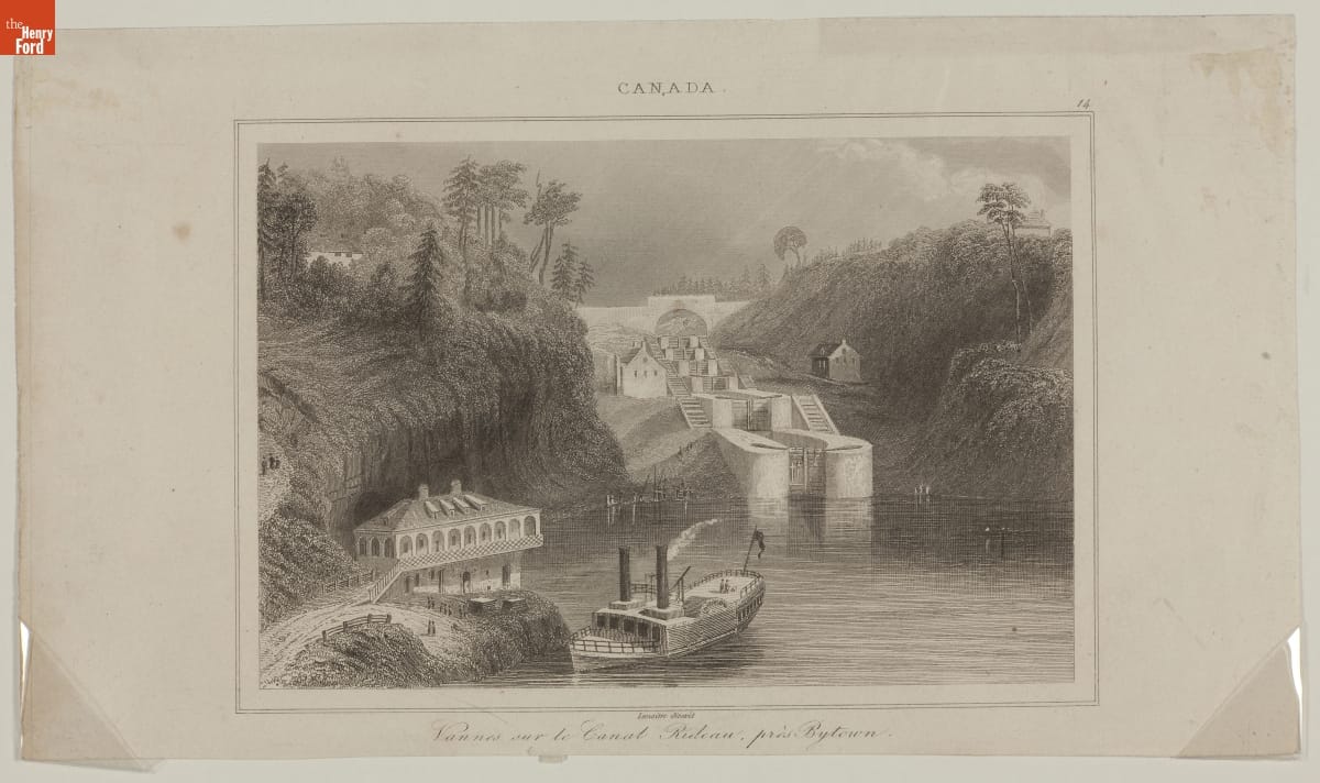 This 1840s engraving features a series of locks in the Rideau Canal near Bytown, now Ottawa, Canada. Construction of the Rideau Canal began in 1826, connecting Ottawa to Kingston, Ontario on Lake Ontario. The Rideau Canal, or Rideau Waterway, is still in use today, with most of its original structures still intact, and registered as an UNESCO World Heritage Site.