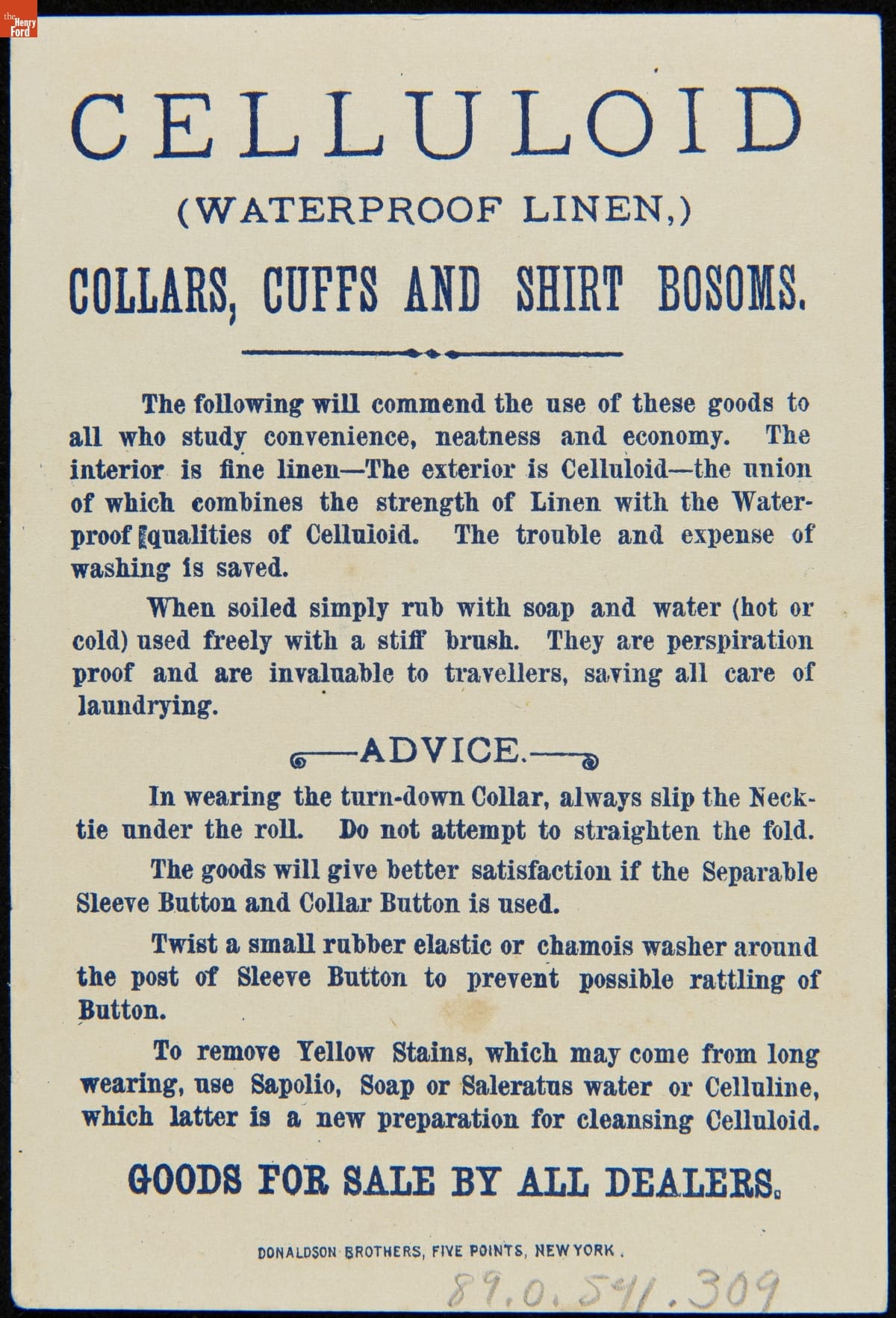 As color printing gained momentum in the late 19th century, trade cards became a major means of advertising goods and services. Americans enjoyed and often saved the little advertisements found in product packages or distributed by local merchants. This trade card advertises Celluloid Waterproof Collars, Cuffs & Shirt Bosoms.