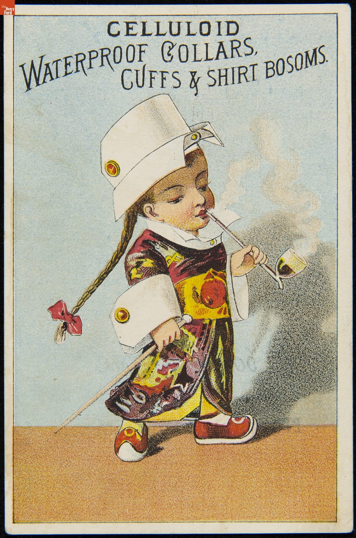 As color printing gained momentum in the late 19th century, trade cards became a major means of advertising goods and services. Americans enjoyed and often saved the little advertisements found in product packages or distributed by local merchants. This trade card advertises Celluloid Waterproof Collars, Cuffs & Shirt Bosoms.