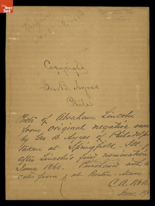 Handwritten in ink on back: "Copyright / Geo B. Ayres / Phila" Handwritten in ink on back in different writing, partially cut off: Photo of Abraham Lincoln / from original negative own[ed] / by Geo B. Ayres of Philadelp[hia] / taken at Springfield - Ill. / after Lincoln's first nomination, / June 1860. This photo purchased with [certifi?]cates / from [Doll & Richards, Inc.] at Boston, Mass. / C.A. Wol[sey], June 19 Stamped in ink on back at bottom: DOLL & RICHARDS, / INCORPORATED / BOSTON