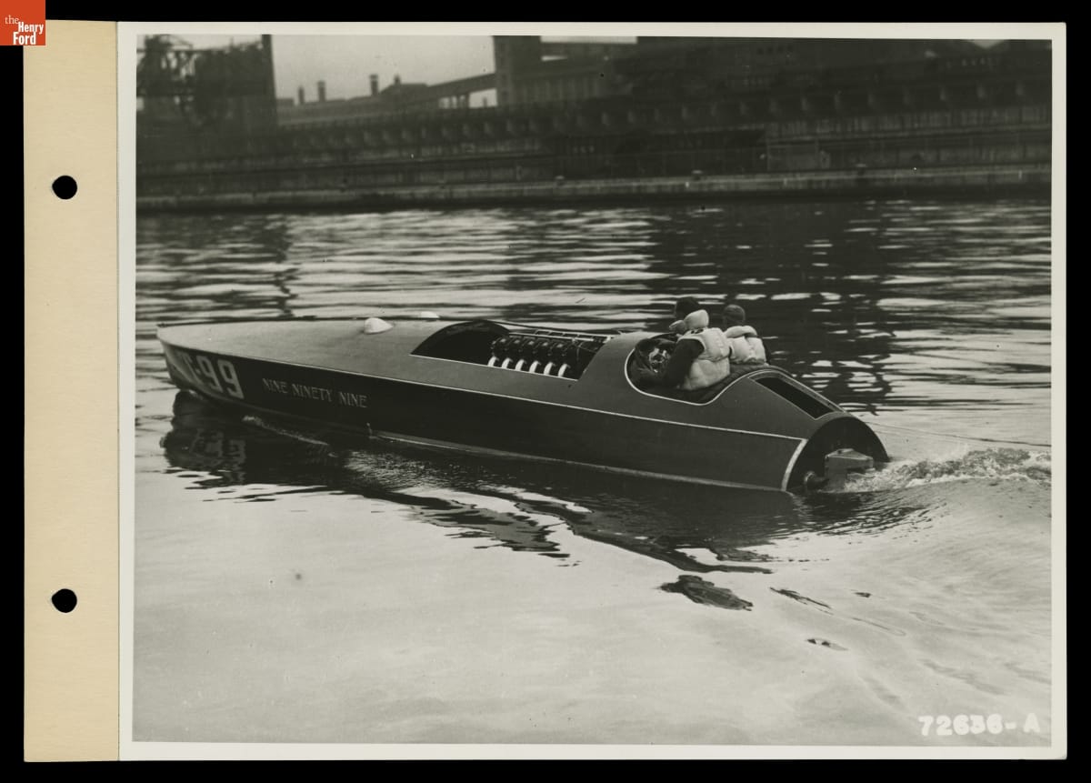 Edsel Ford named his speedboat Nine Ninety Nine in tribute to the "999" race car built by his father in 1902. The younger Ford enjoyed spending time on the water, whether sailing for pleasure on a yacht or racing at top speed in a powerboat.