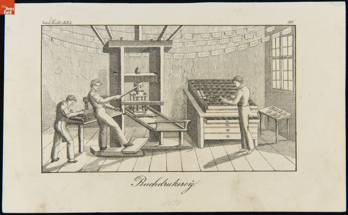 Men Working in a Book Printing Shop, "Buchdrukerey," circa 1830