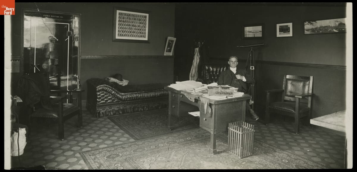 Henry Ford strikes a regal pose in his office at Ford Motor Company's Piquette Avenue Plant around 1908. Ford was probably working on the design of the new Model T at this time. Henry's offices were always neat and tidy because Henry was rarely in them. He spent most of his time out in the factory.
