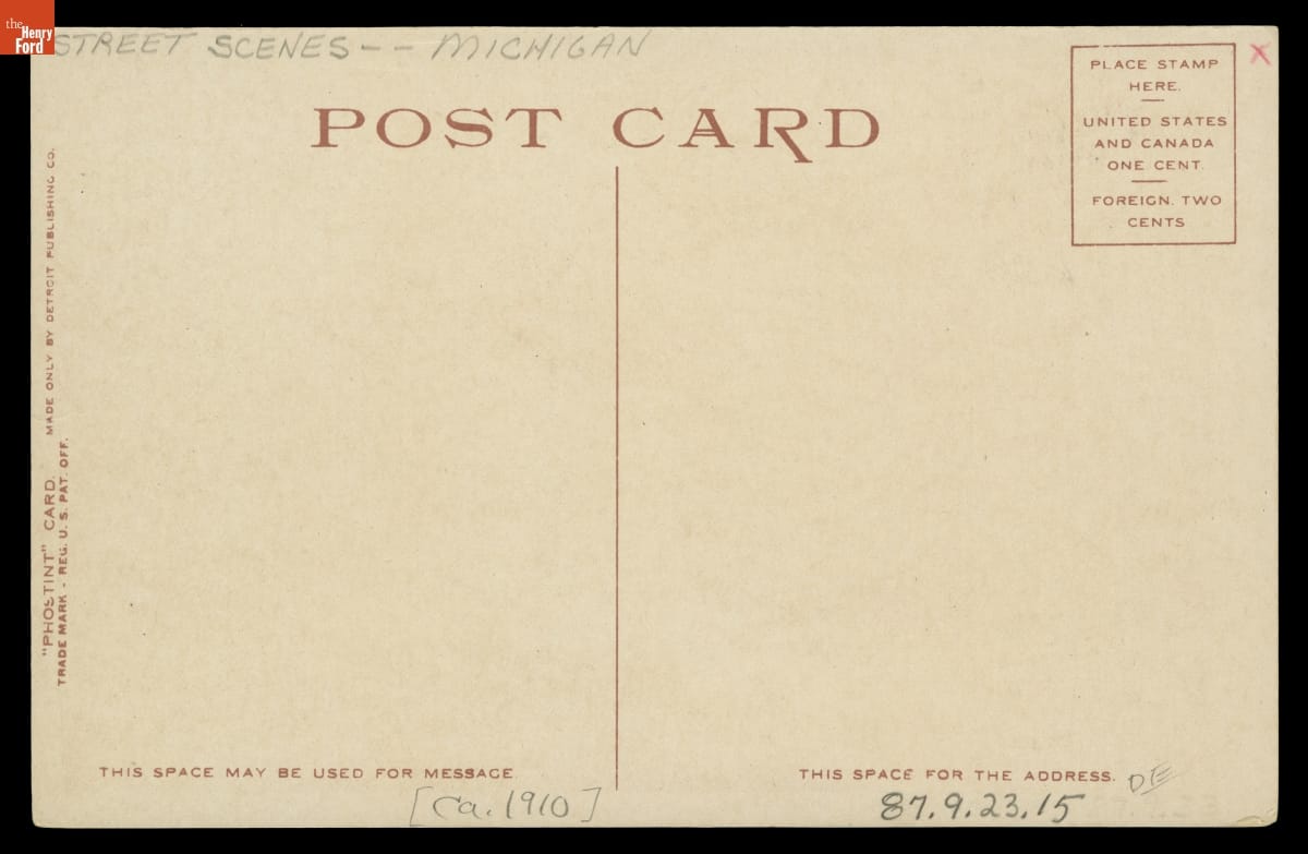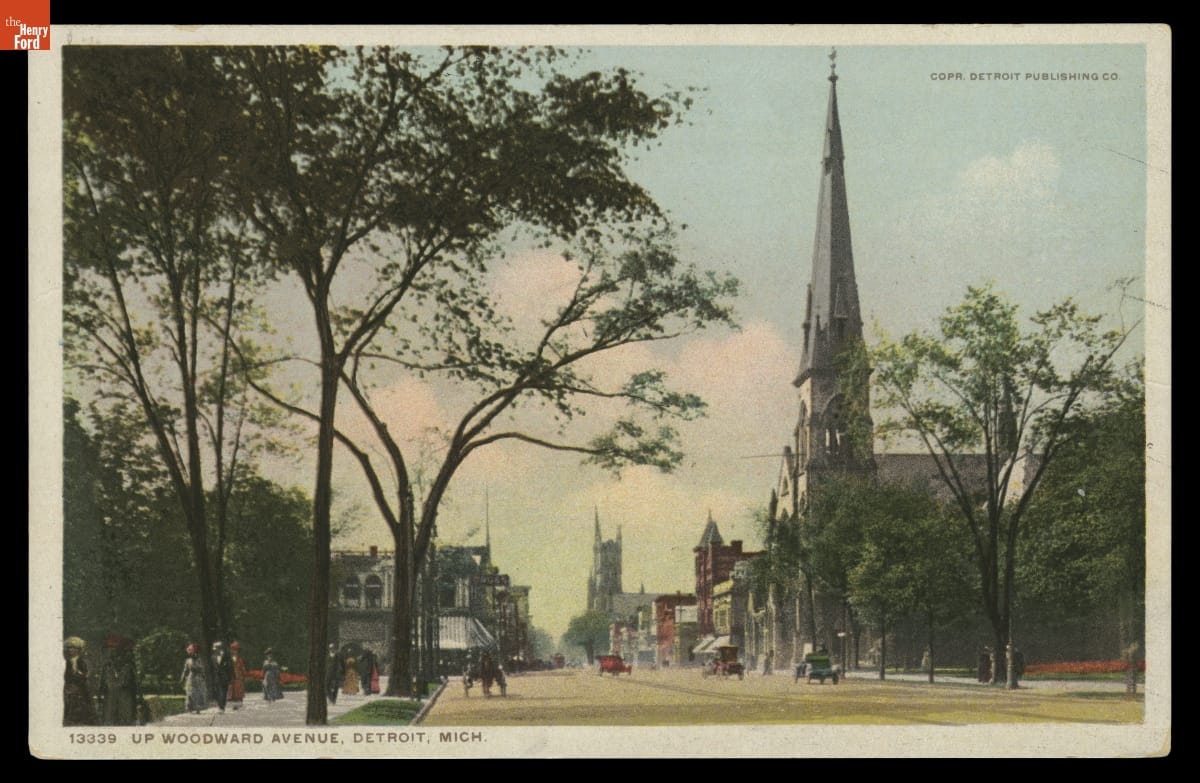 Postcard, "Up Woodward Avenue, Detroit, Michigan," circa 1910