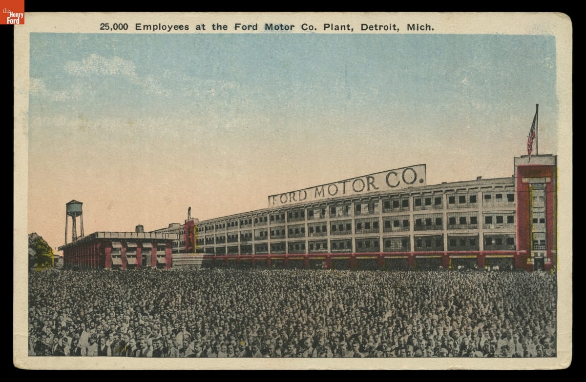 Thousands of Ford Motor Company employees posed at its Highland Park plant for this photograph in 1913. Ford published the photo in Ford Times, the company's magazine, and described it as "the largest specially posed photograph ever taken." Still, the 25,000 number on the postcard was exaggerated -- Ford employed closer to 15,000 people in the plant at the time.