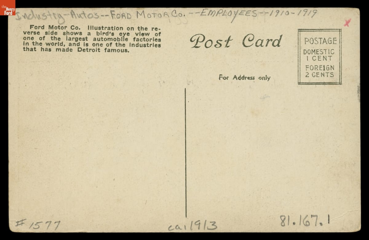 Text at top of postcard front: 25,000 Employees at the Ford Motor Co. Plant, Detroit, Mich.