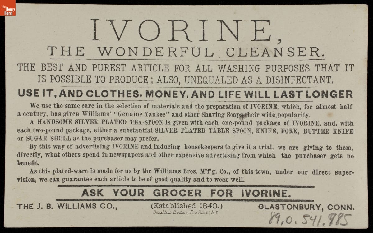 Trade Card for Ivorine Cleanser, J. B. Williams Company, 1880-1890