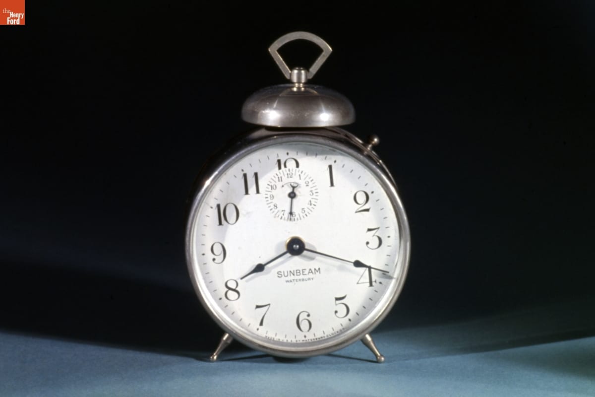 By the late 19th century, spring-driven, key-wound alarm clocks helped Americans wake up and arrive on time for work, school and appointments. Manufacturers sometimes gave these inexpensive clocks imaginative names to help sell their products. The Waterbury Clock Company named this model "Sunbeam" -- perhaps to suggest being awakened by the sun's rays rather than the clock's harsh clanging bell.