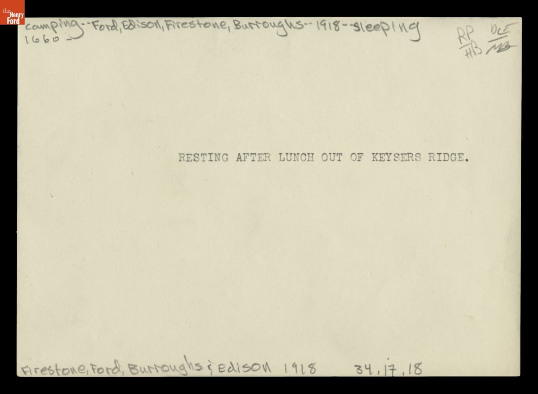 Harvey Firestone, Thomas Edison, Henry Ford and John Burroughs on a "Vagabonds" Camping Trip, 1918