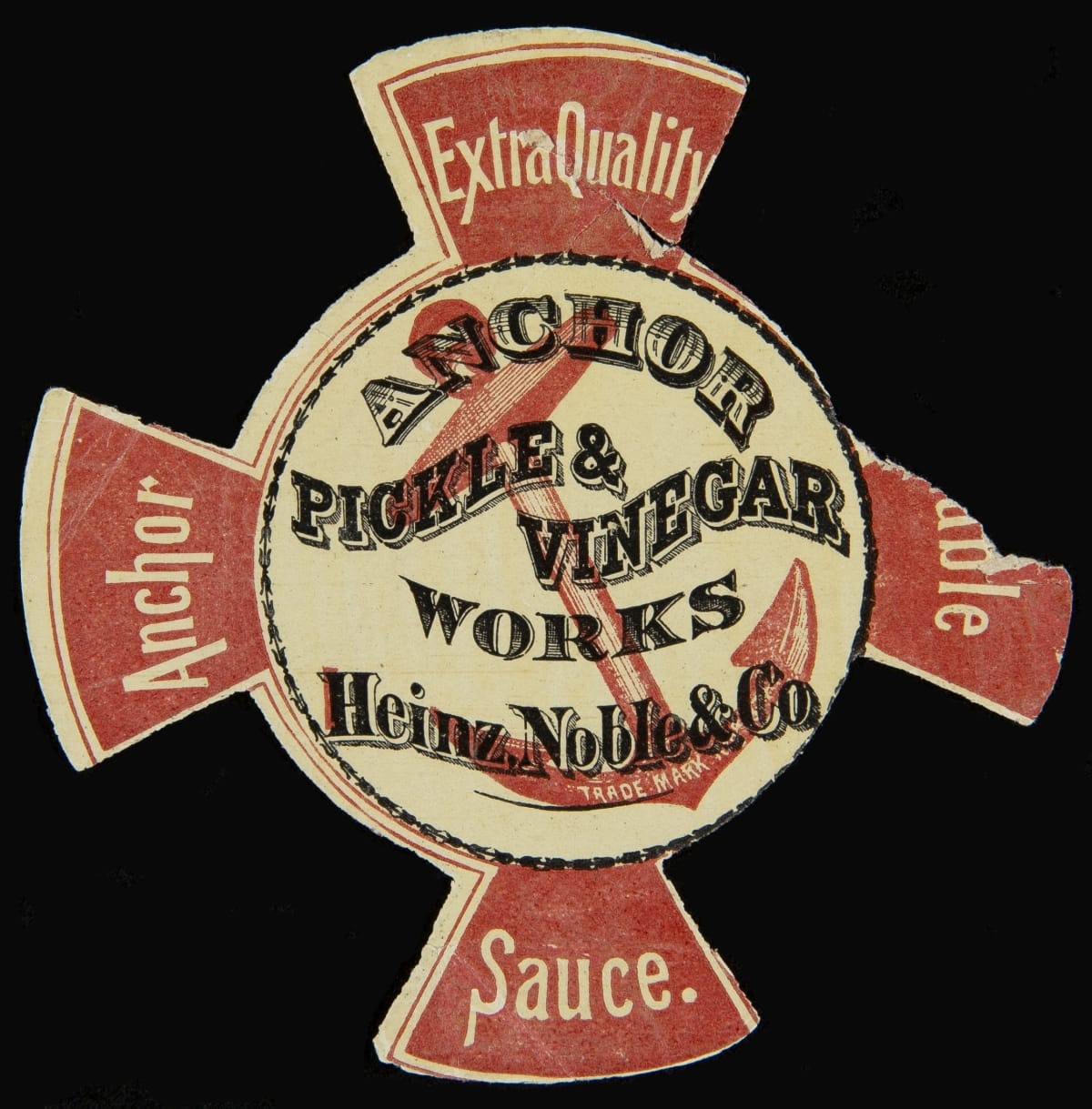 reading : ANCHOR/ PICKLE & VINEGAR/ WORKS/ HEINZ, NOBLE & CO. In the circular center of the label. Protruding from the circle are the words ANCHOR; EXTRA QUALITY; SAUCE; ___UBLE(portion ripped).