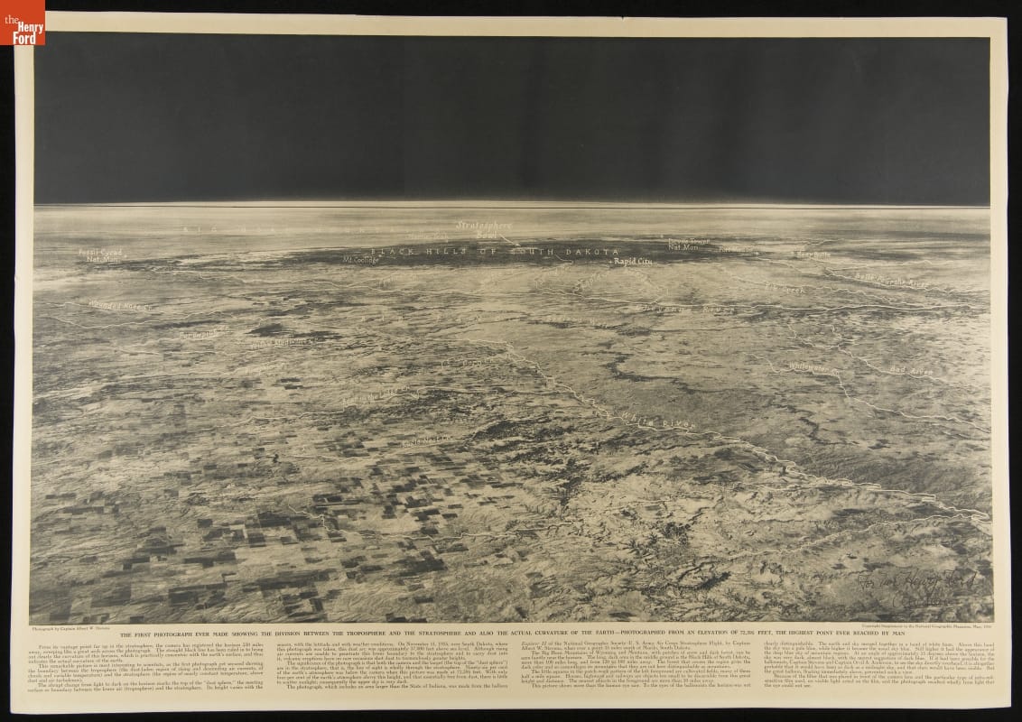 printed on front below image: THE FIRST PHOTOGRAPH EVER MADE SHOWING THE DIVISION BETWEEN THE TROPOSPHERE AND THE STRATOSPHERE AND ALSO THE ACTUAL CURVATURE OF THE EARTH--PHOTOGRAPHED FROM AN ELEVATION OF 72,395 FEET, THE HIGHEST POINT EVER REACHED BY MAN written on front, lower right corner: For Mr. Henry Ford / A.W. Stevens