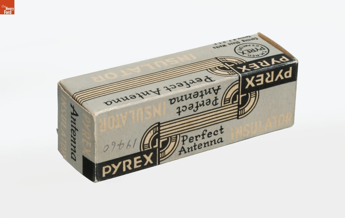 on two sides of box: PYREX / Perfect Antenna / INSULATOR / T.M. REG. / PYREX / U.S. PAT. OFF. / Corning Glass Works / Corning, N.Y. U.S.A. on side of box: PYREX / Perfect / Antenna / INSULATOR on side of box: PYREX RESISTANT GLASS / is the ideal material for Antenna insulators as it / is non-porous and does not attract nor retain / surface moisture. Breaking strain 450 lbs. on ends of box: PYREX / Antenna / INSULATOR on insulator: PYREX / MADE IN U.S.A. / PAT. 1700066