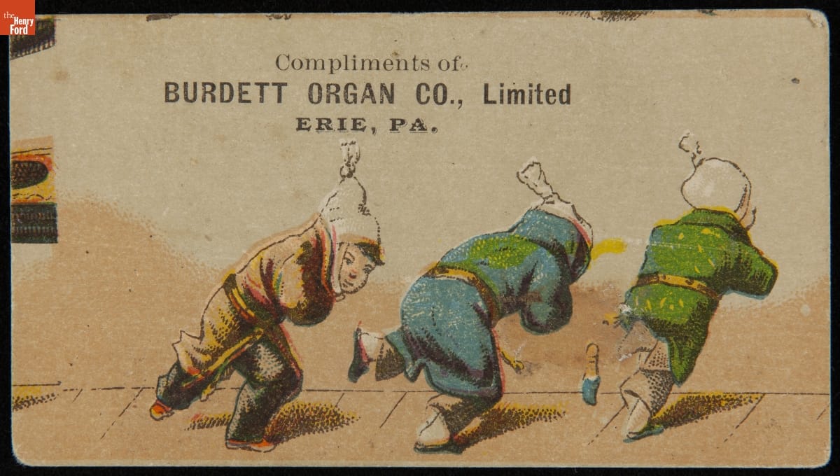 As color printing gained momentum in the late 19th century, trade cards became a major means of advertising goods and services. Americans enjoyed and often saved the little advertisements found in product packages or distributed by local merchants. This trade card advertises the Burdett Organ Company.