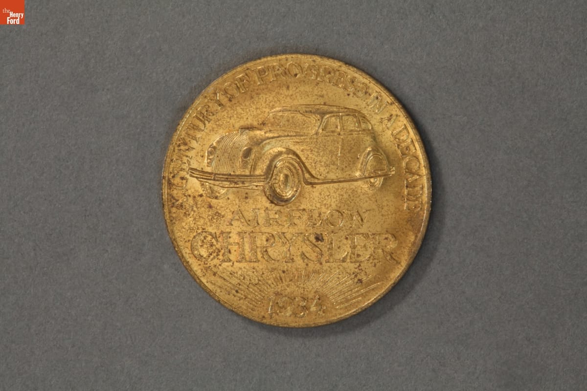 Chicago's 1933-34 Century of Progress Exposition used the theme of progress to buoy national optimism during the Depression's darkest years. Chrysler Motors, one of many manufacturers with a major presence at the fair, constructed a large pavilion and distributed souvenirs to fairgoers. This brass medallion commemorated Chrysler's first ten years -- a "Century of Progress in a Decade."