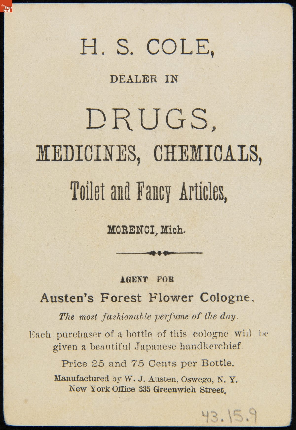 Product manufactured by W.J. Austen & Company, Oswego, New York. Retailed by H.S. Cole, Morenci, Michigan.