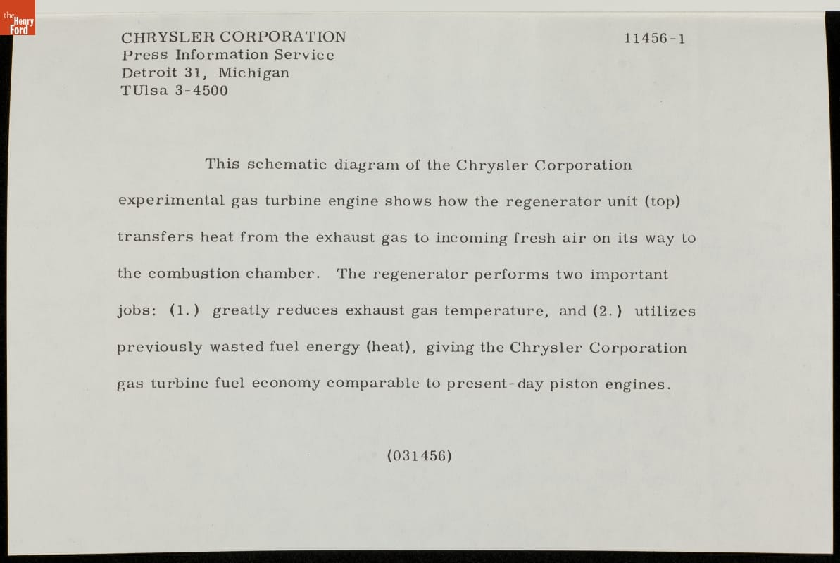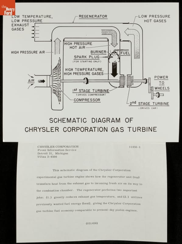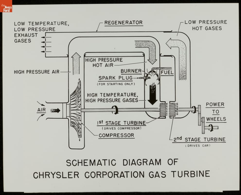 In 1963, Chrysler lent 50 cars with gas turbine engines to potential customers. The engine's regenerator, shown in this diagram, was designed to increase fuel economy. Chrysler claimed its gas turbine engine would get comparable miles-per-gallon to a piston engine, but users complained about poor fuel economy. Rising gasoline prices ultimately killed the turbine dream.