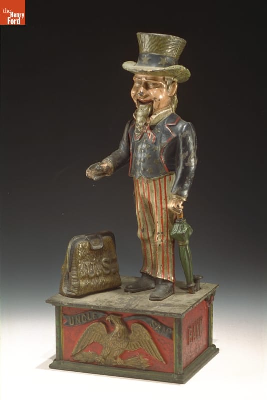 Cast iron mechanical banks, which used ingenious mechanisms to deposit the money, became particularly popular between 1870 and 1930. Banks were produced in a variety of forms. When the button behind Uncle Sam's left foot is pressed, the coin in his right hand is deposited into the open valise at the same time that his beard whiskers move.